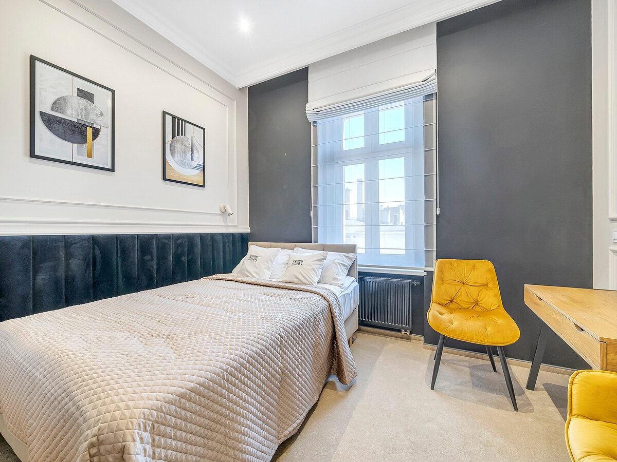 Kompaktowy, elegancki pokój dla pary, urządzone w stylu butikowym. Na Gości czeka wygodne łóżko typu queen-size, jasne wnętrze z klasycznymi sztukateriami oraz nowoczesna łazienka z dużym prysznicem. Ciepła wykładzina, stonowana kolorystyka oraz żółte akcenty w postaci foteli tworzą przytulną przestrzeń zarówno do wypoczynku, jak i pracy. Pokój idealny na krótki pobyt w mieście, dla osób ceniących styl, ciszę i wygodę.