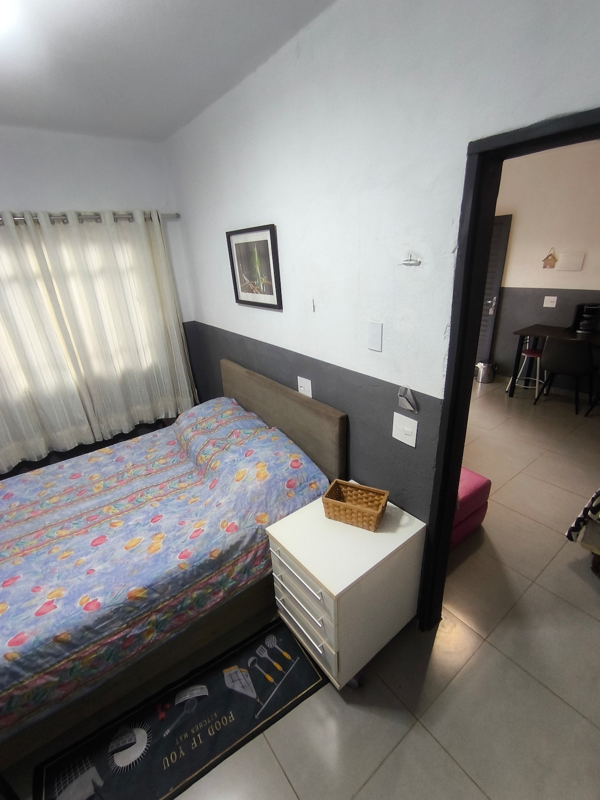 O espaço é um studio totalmente privativo para até 2 pessoas em um sobrado. Quarto com AR CONDICIONADO, cama box de casal, guarda roupas, Smart TV (Youtube, Netflix, etc.), Internet de fibra óptica, escrivaninha e cadeira. Cozinha completa, jogo de cama, mesa e banho. Lavanderia com máquina de lavar, tanque e varal. Vaga para 1 veículo em garagem com portão eletrônico. Localização ótima, próximo ao centro, em rua comercial com fluxo durante o dia e tranquila durante a noite e finais de semana