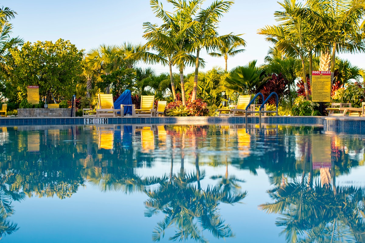 Appartamento fronte mare con 2 camere da letto e 2 bagni, letto matrimoniale king size, letto matrimoniale queen size e divano letto. A 10 metri dal mare: porta la tua barca! Goditi una cucina in quarzo completamente attrezzata con elettrodomestici in acciaio inossidabile. Situato a Venture Out, un tranquillo resort recintato adatto alle famiglie con pesca, pesca all'aragosta, piscine, vasca idromassaggio, pickleball, tennis, basket, centro ricreativo, biciclette, kayak e SUP. Tra Key West (20 miglia) e Marathon. Wi-Fi gratuito; TV Roku in entrambe le camere da letto e nel soggiorno. Kayak, SUP e area deposito con frigo extra e congelatore per esche.