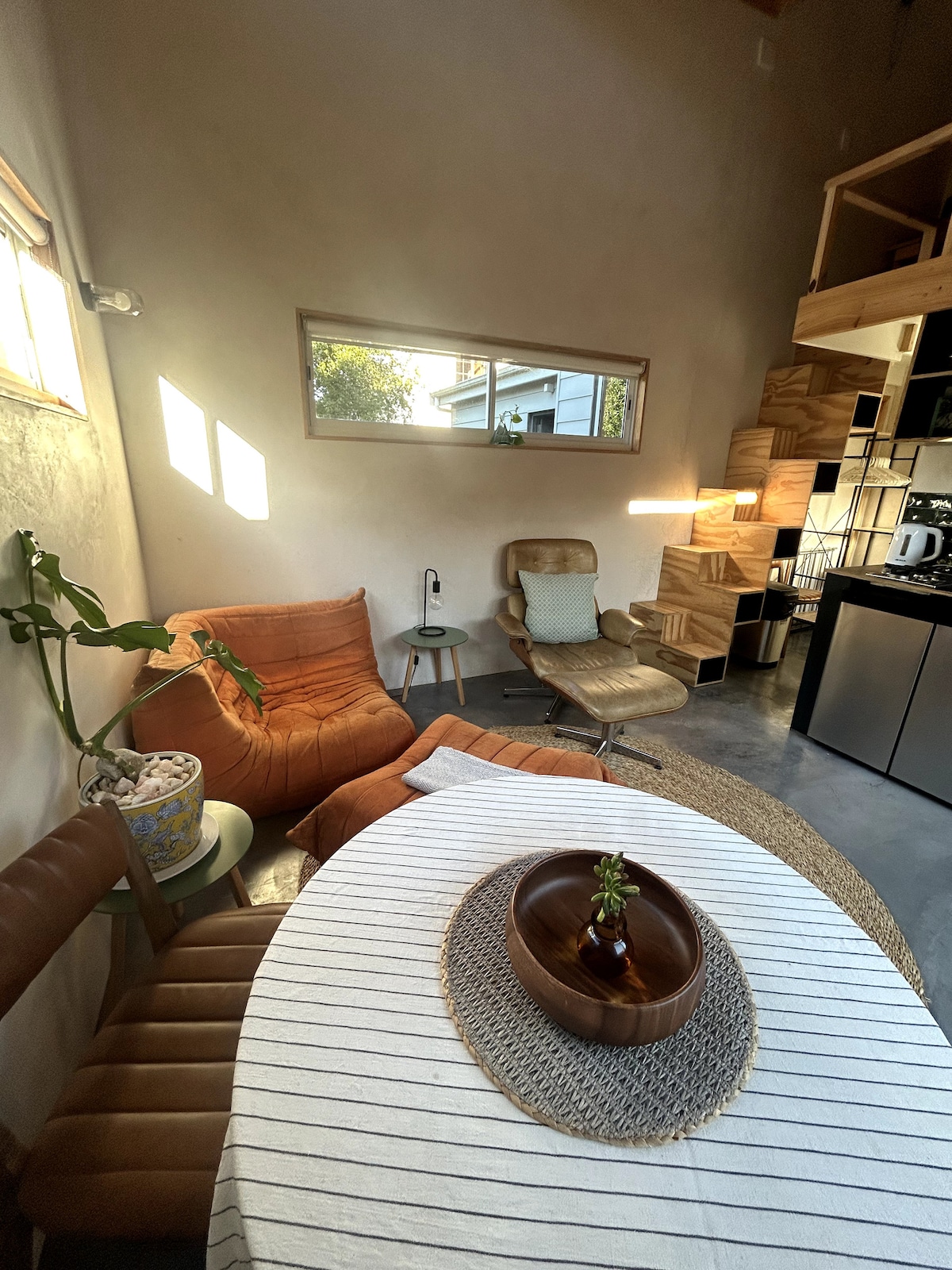 Modern luxury in relaxed bedsit studio filled with sunshine and light. Queen size bed and en-suite bathroom with large shower; kitchenette with under counter fridge, microwave, induction cooker and kettle, plus table for two for work or eating. Wall safe, 30/30 fibre Wi-Fi plus multi channel Satellite TV and Netflix. The sun splashed Bedroom has a stacking door that leads onto deck, with your own lemon tree and seasonal herbs or spices, plus relaxing day bed and outdoor dining table for two.