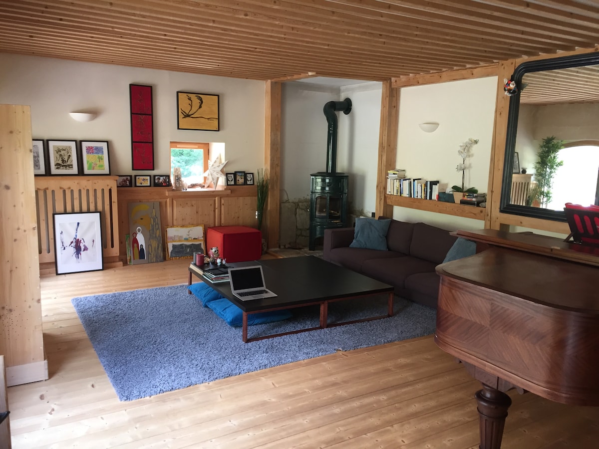 Casa classificata del 1808, restaurata con gusto (pietre a vista, pavimenti in parquet...) e arredata in modo moderno con tutti i comfort (camera con spogliatoio, internet, TV-musica...), nel mezzo di un ampio giardino/parco, nel cuore del Parco Naturale dell'Haut-Jura e a soli 55 km da Ginevra e dal suo aeroporto. Il luogo ideale per venire a riposare in famiglia o con gli amici, e per gli sport invernali (piste da sci a 5 minuti, stazione di Les Rousses a 15 minuti) o mountain bike, laghi, cavallo...