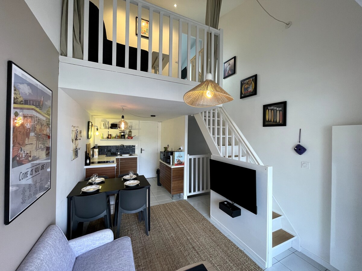 Rilassatevi in questo alloggio tranquillo ed elegante. Appartamento T1 completamente attrezzato situato al piano terra di una casa occupata da una coppia di giovani pensionati. Questo alloggio indipendente, nuovo, immerso nel verde, situato a 10 minuti in bicicletta dai negozi, a 1500 metri a piedi dalle spiagge attraverso la foresta vi sedurrà con la sua tranquillità. Potrete scoprire la foresta demaniale e il suo percorso sportivo, percorrere le piste ciclabili del litorale direttamente dall'appartamento.