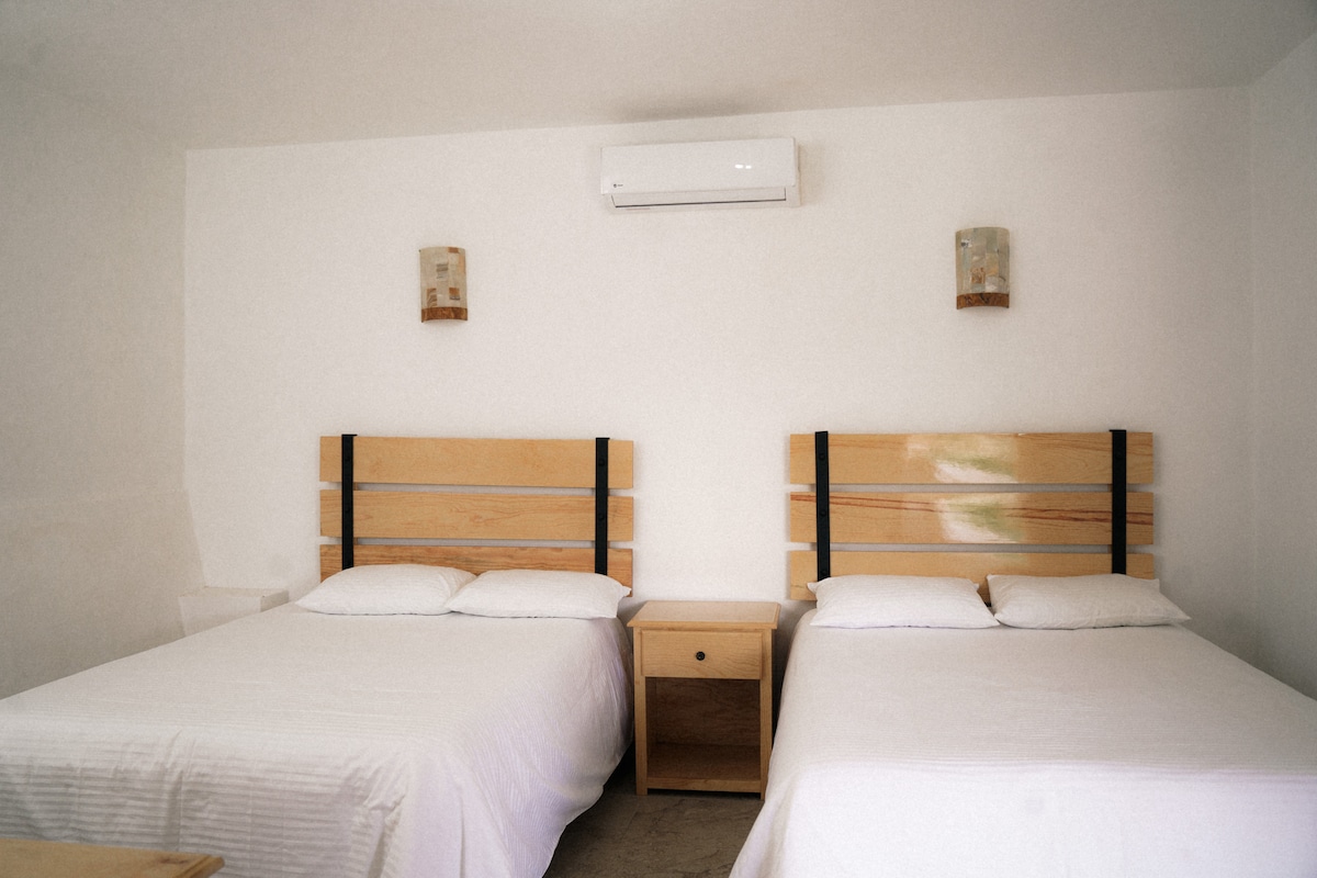 Es una cabaña de construcción ecológica ideal para parejas, o una familia, tiene jardín, en su interior encuentras la acogedora arquitectura de madera y adobe, descubrirás cómo todos los espacios fueron diseñados para descansar y disfrutar la convivencia, está ubicada en un típico barrio mexicano a 20min caminando de la plaza principal. A beautiful cabin made from ecological materials, it has a Garden, In the interior you will find how every space was design for resting