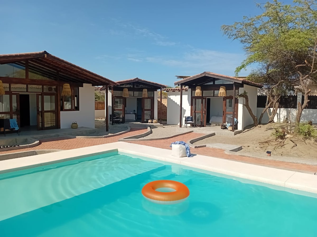 Scopri la serenità del paradiso nel nostro incantevole bungalow a Vichayito. Questo accogliente rifugio, perfetto per un massimo di 4 persone, offre due eleganti camere, una piccola cucina completamente attrezzata, un bagno privato e una splendida terrazza che ti conquisterà con la sua vista mozzafiato sull'oceano, dove potrai rilassarti con la dolce brezza marina e vivere un'esperienza indimenticabile a Vichayito. Inoltre, goditi la nostra area comune con una splendida piscina perfetta per condividere momenti indimenticabili.
