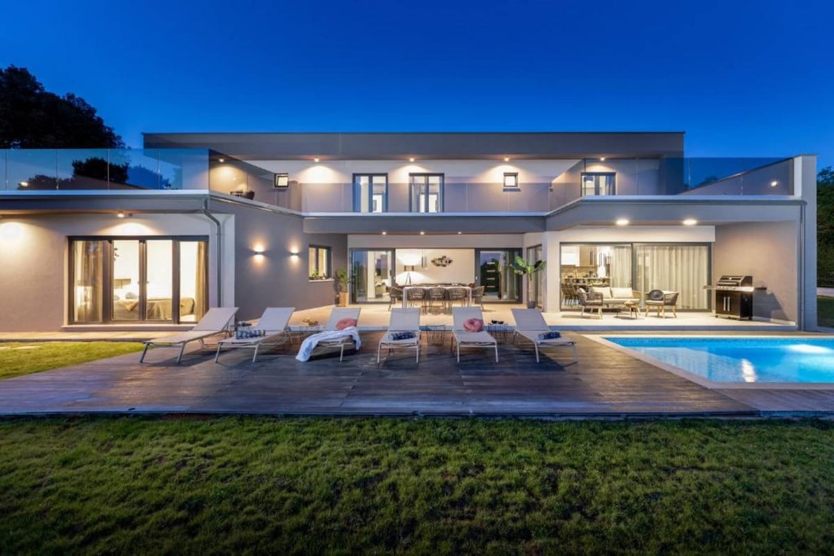 Villa moderna con vista mare a Brovinje vicino a Labin, con piscina infinity riscaldata, jacuzzi esterno, sauna, palestra e sala giochi. Situata in posizione elevata con vista panoramica sull’Adriatico, offre 4 camere per fino a 8 ospiti — ideale per famiglie o gruppi che cercano privacy, benessere e uno stile di vita costiero rilassato in Istria.