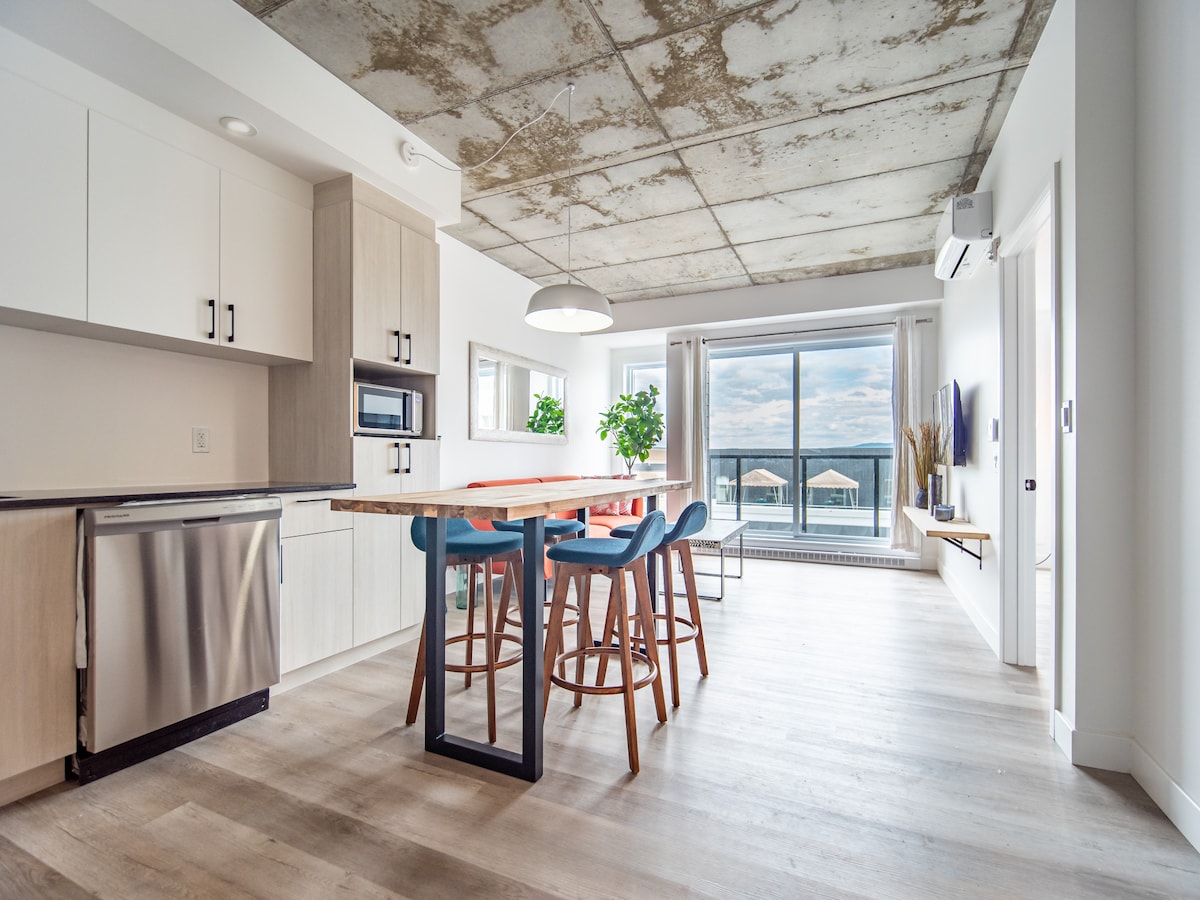 No parties allowed. 6 people maximum. Beautiful apartment located on the 2nd floor. Unique view and direct access to the St. Lawrence River. Open-concept space with cathedral ceiling including kitchen, dining room, and living room. 2 bedrooms with queen beds and 2 sofas that convert into single beds. Shared access to a lookout, heated pool, fire pits, BBQ, Etc. CITQ #310546 Another unit available on the 1st floor of the same building: airbnb.ca/h/petit-paradis-du-st-laurent