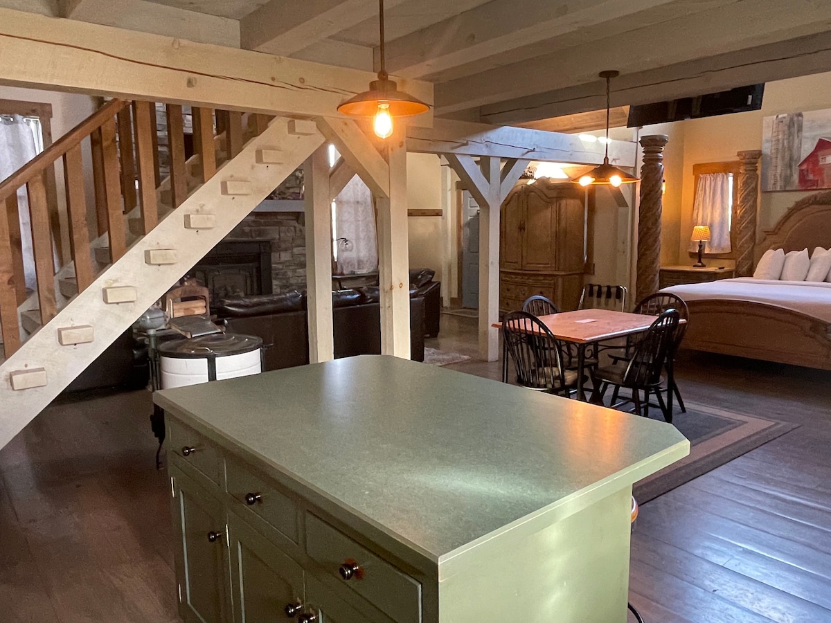 Un pittoresco e accogliente chalet recentemente ristrutturato nel 2025, su 60 acri boscosi, perfetto per una vacanza di coppia. A 8 minuti da un fantastico centro città, dove fare shopping in boutique uniche, ristoranti, cantine locali, birrerie e distillerie! Goditi la pace e la tranquillità in un ambiente naturale. Accogliente fino a un enorme caminetto a legna in pietra sia all'interno che sul portico schermato. La nuovissima vasca idromassaggio privata, che vanta acqua di sorgente naturale, si trova appena fuori dalla porta della baita e si affaccia sugli stagni naturali.