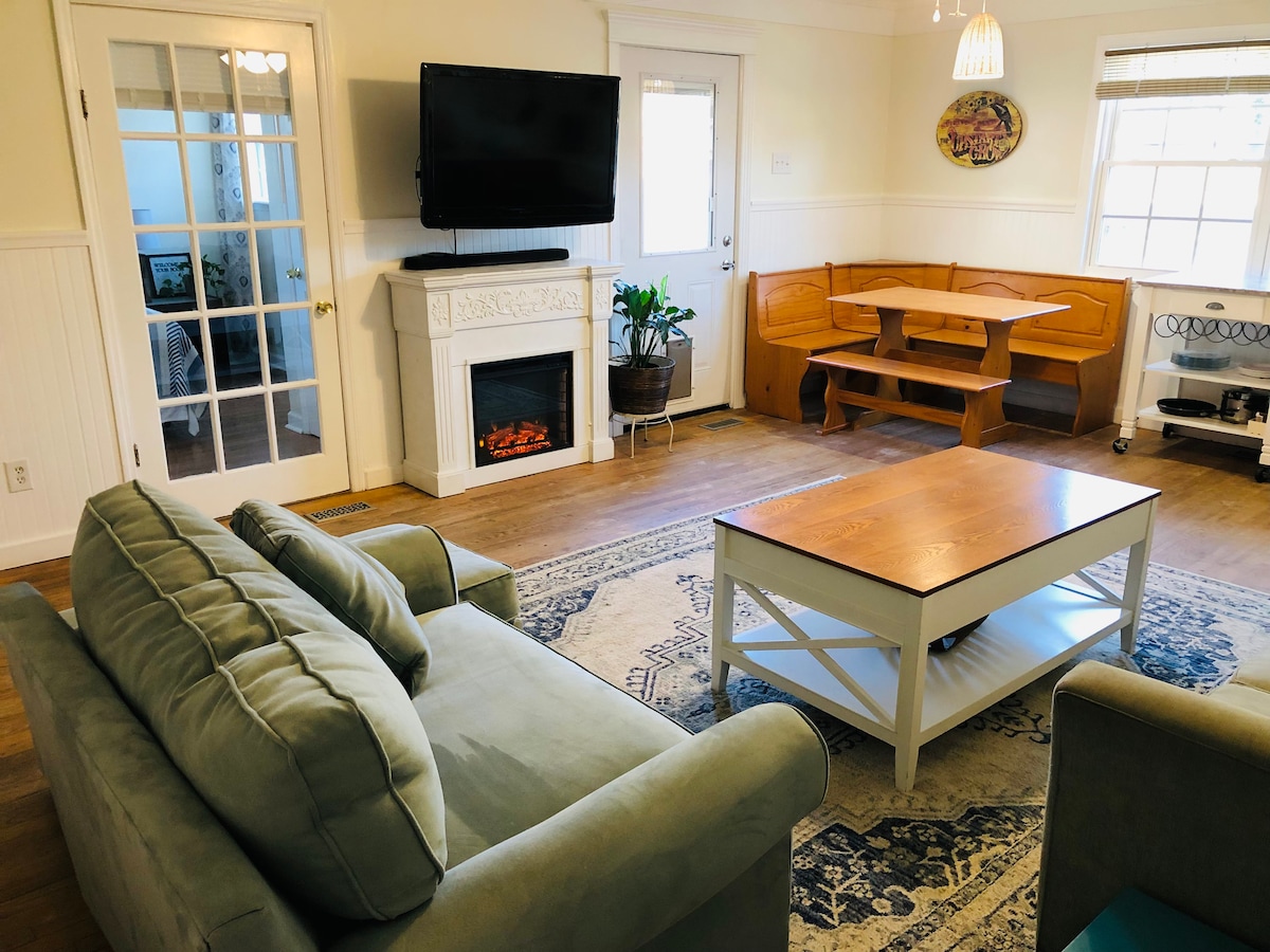 Base Camp, costruito per l'avventuriero maestoso nel cuore:) Una suite privata unica, di qualità e su misura al 2° piano con angolo cottura, ingresso privato e facile accesso al parcheggio gratuito fuori strada. Pulito, tranquillo, con vista dalle finestre sulle cime degli alberi, portico coperto privato con posti a sedere, divano in pelle di alta qualità, piastrelle, legni duri, bagno termale, canali via cavo su una smart TV. Questo piccolo quartiere del 1903 si trova a solo uno o due isolati a piedi da tutto ciò che il centro di Wake Forest ha da offrire :)