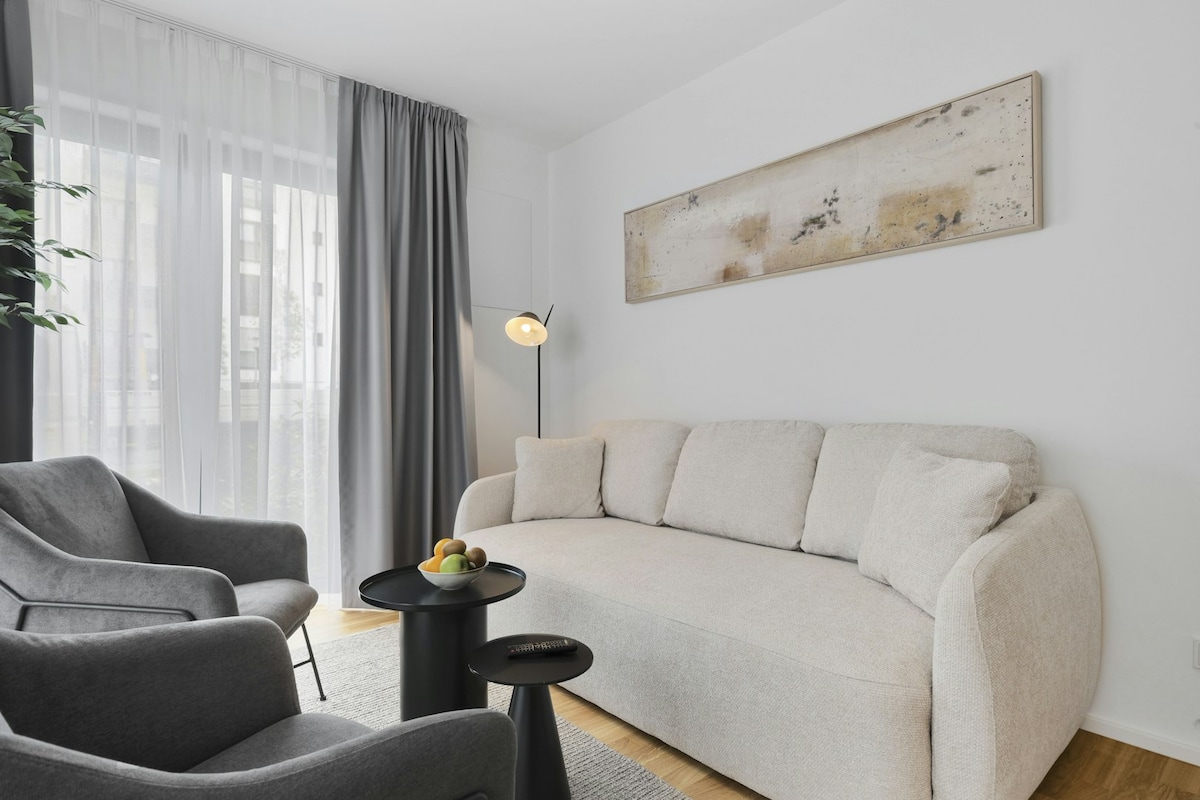 Goditi un elegante appartamento di nuova costruzione con un'atmosfera open space, una camera da letto separata con un accogliente letto matrimoniale e un comodo divano letto nella zona giorno. Il bagno moderno con doccia a pavimento conferisce un'atmosfera da hotel, mentre la cucina completamente attrezzata con zona pranzo ti fa sentire come a casa.