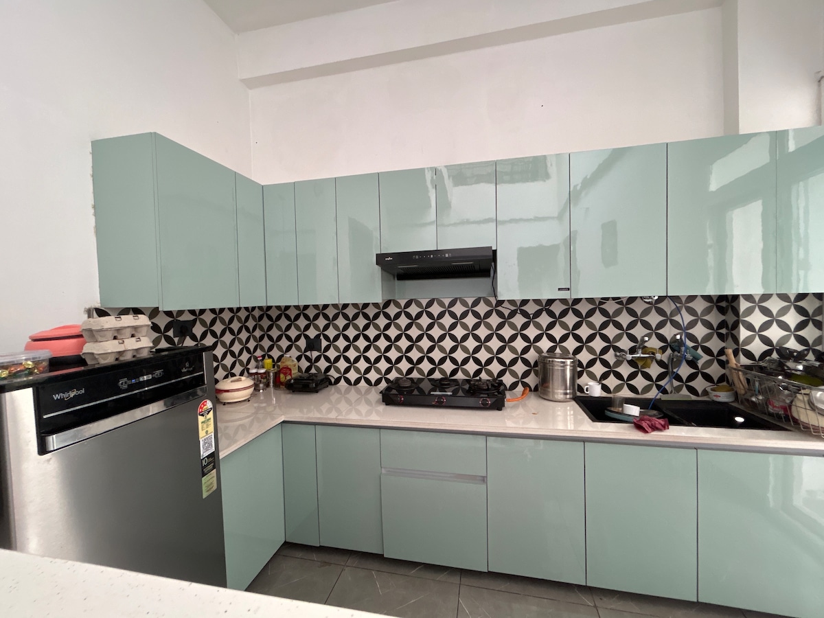 Nivas a Gomti Nagar: Entrando dalla porta d'ingresso si accede al soggiorno con la cucina e la veranda sulla sinistra e la camera da letto principale nella parte anteriore. La camera da letto principale è dotata di letto matrimoniale e bagno annesso. Anche la seconda camera da letto è dotata di un bagno annesso e di un balcone. La cucina è completamente attrezzata con tutto il necessario per pasti grandi o piccoli, tra cui piano cottura a gas, frigorifero, pentole e posate