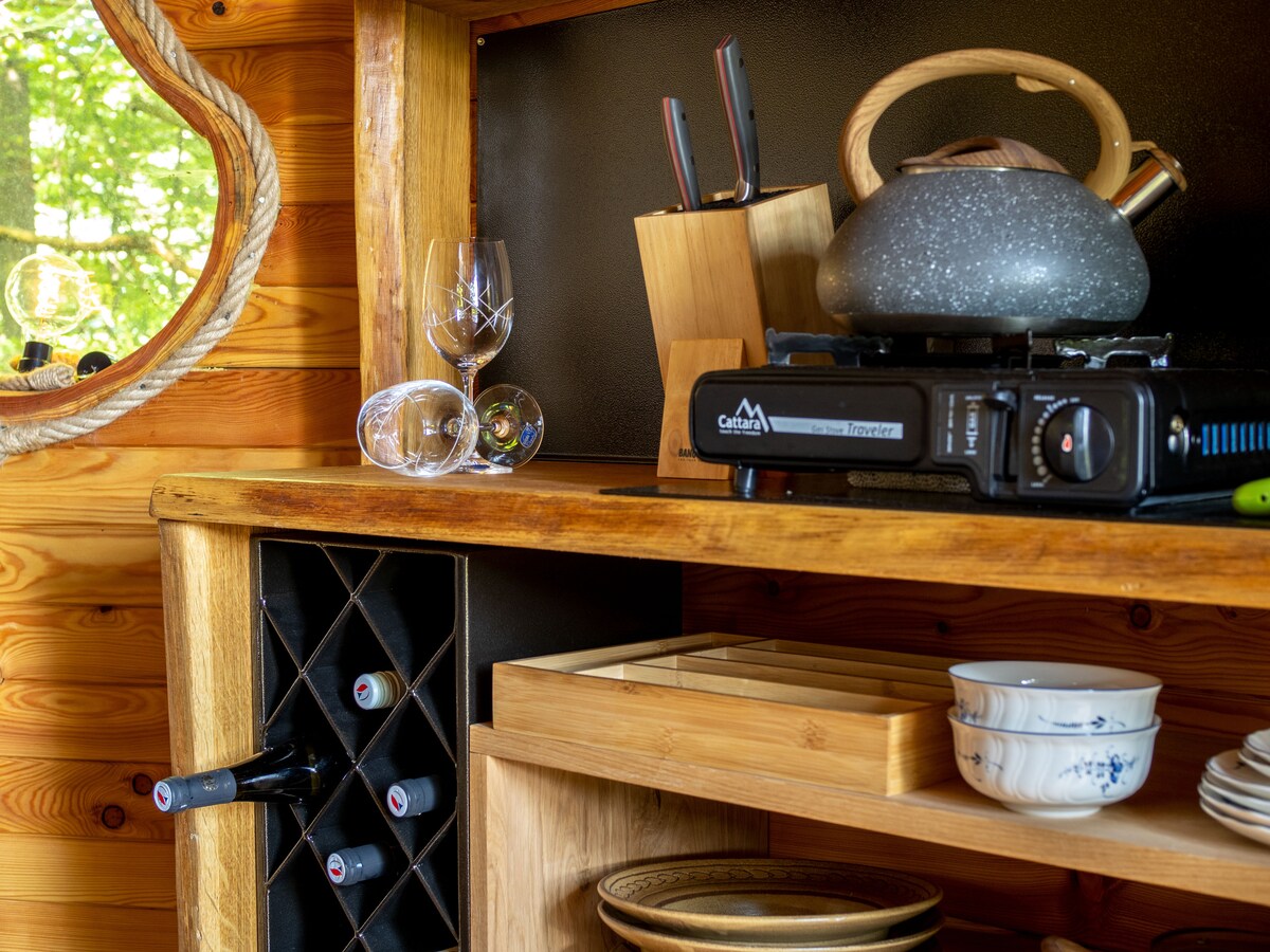 Alloggio in armonia con la natura in completa privacy, relax in una sauna finlandese o in una botte da bagno all'aperto con griglia da giardino. La sera, puoi goderti un po' di romanticismo accanto al caminetto o ammirare le stelle sulla terrazza sopraelevata. L'accogliente interno offre una cucina completamente attrezzata con piano cottura, stoviglie, bollitore e frigorifero. Bagno con doccia e WC con sciacquone. Cerchiamo di essere rispettosi della natura, quindi il bagno è dotato anche di cosmetici biologici. Il cottage è dotato anche di wifi.