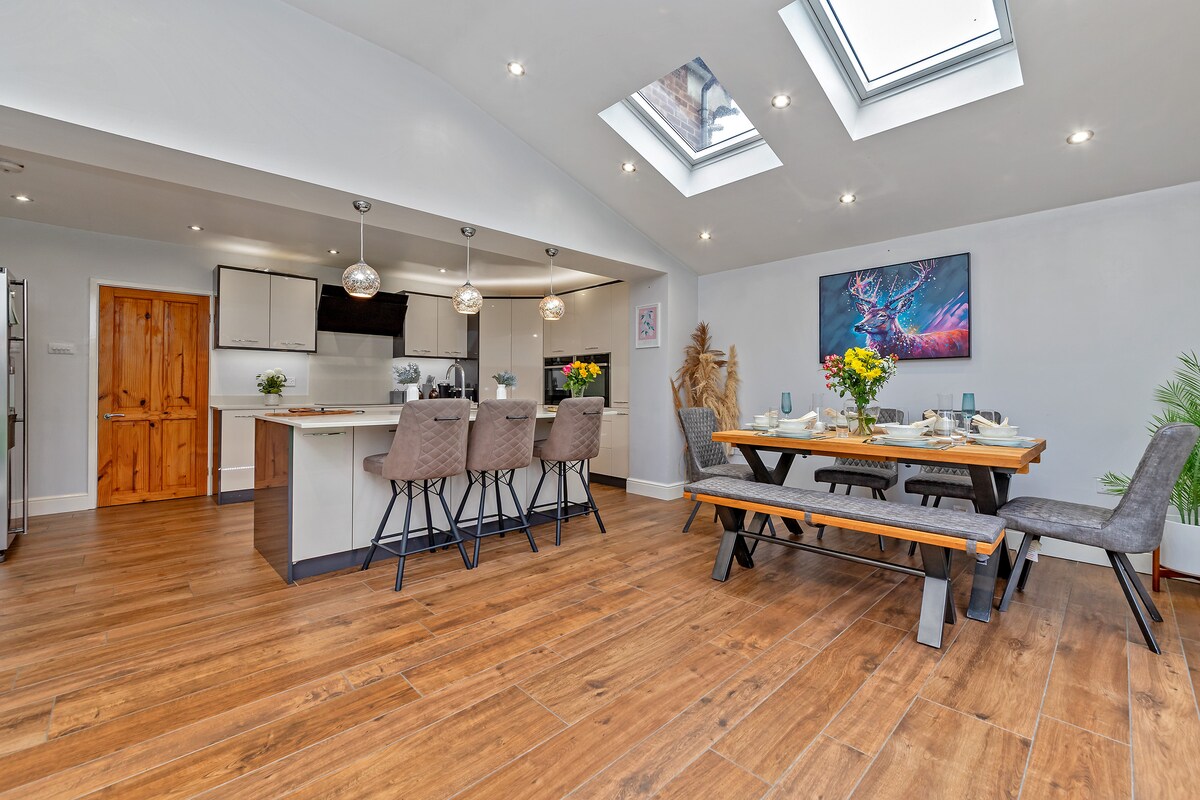 Una casa familiare moderna e spaziosa con 3/4 letti, che può ospitare fino a 8 persone, con vasca idromassaggio privata. La luminosa e ariosa cucina/zona pranzo è perfetta per quella sensazione di interno/esterno. Una scelta di aree di accoglienza, tra cui uno spazio abitativo aperto con TV o l'accogliente area salotto per i film in famiglia. Con banda larga superveloce (~370 Mbps), Smart TV e prese USB per intrattenere tutti. Le camere da letto con colori curati e biancheria di cotone di alta qualità garantiscono un sonno tranquillo.
