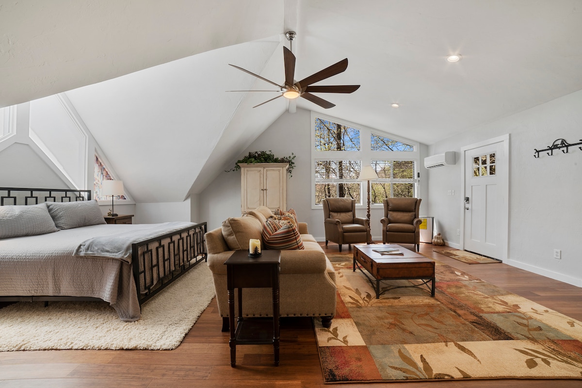 Studio apartment with private entrance, dedicated parking & small deck among the trees. Renovated 2021. Isolated from main house. King size bed and a large sofa that sleeps one. There is a two-burner stove top, microwave/convection oven, refrigerator, dishwasher, 50" 4k TV and Wifi. Pet friendly. Notify before booking. Will send offer w $75 pet fee. Failure to do so $500 fee.