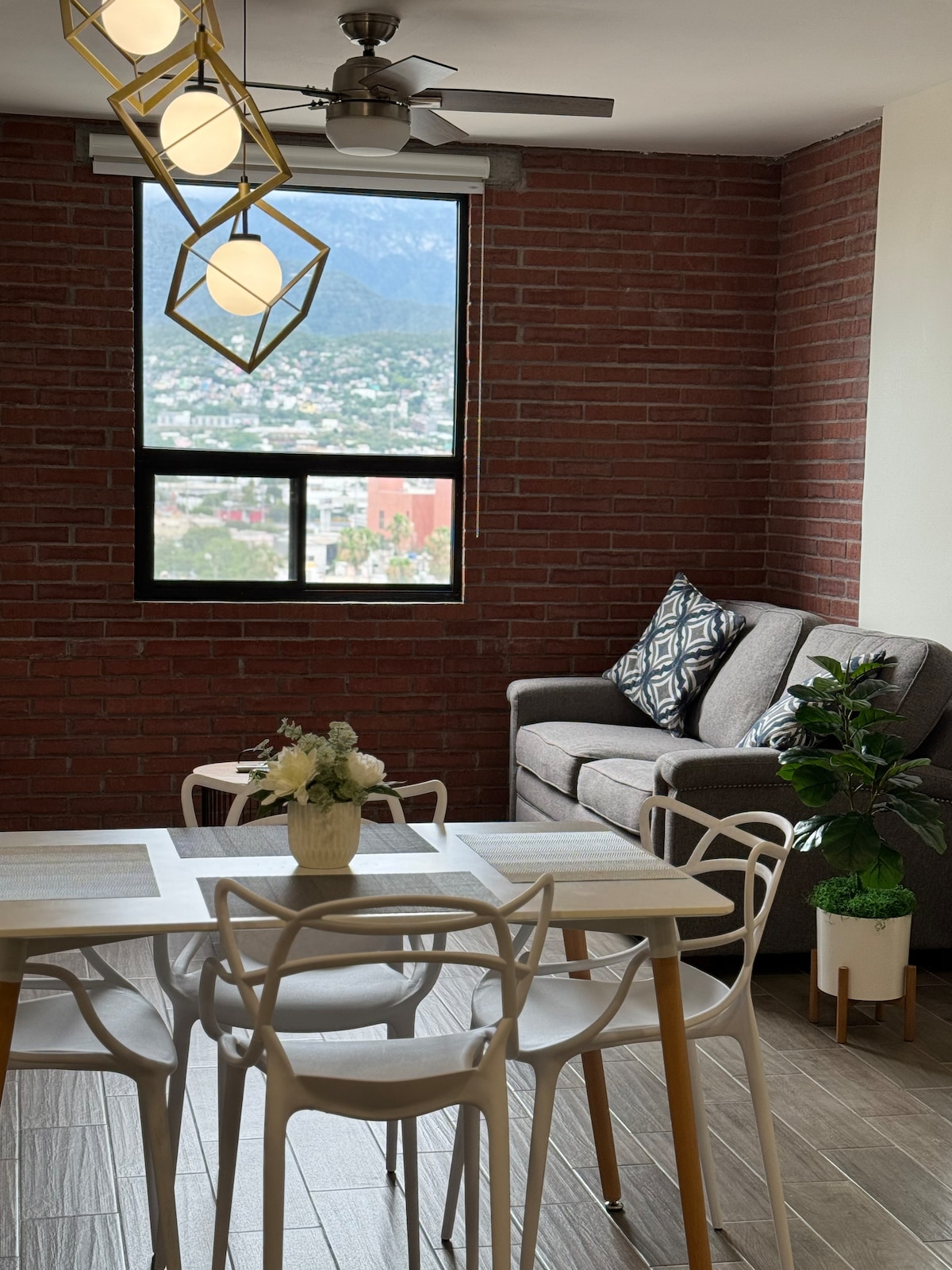 Appartamento in stile loft in una delle migliori posizioni a sud della città, con vista sulla splendida collina del Cerro de la Silla. Può ospitare fino a 5 persone, dispone di 2 letti matrimoniali e un divano letto, cucina attrezzata, 2 balconi di cui uno con barbecue, 1 posto auto, palestra e lavanderia a pagamento all'11° piano. È molto vicino ai principali centri commerciali e negozi di alimentari, nonché a discoteche e ristoranti, a 10 minuti dal centro e dal Parco Fundidora.
