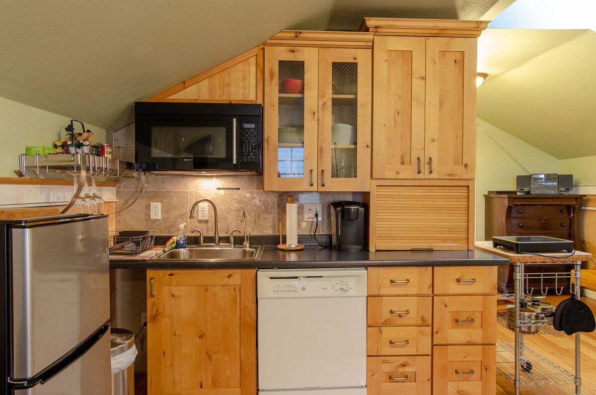 Situato a soli 21 km da Olympia, nello stato di Washington, questo cottage combina finiture artistiche e il fascino rustico della foresta circostante. All'interno, c'è una scala in legno unica nel suo genere che conduce al letto matrimoniale a soppalco, oppure goditi il lettino premium al piano di sotto. C'è una cucina completamente attrezzata con un frigorifero per il vino. Il bagno include una doccia a pioggia unica illuminata a LED; non dimenticare di fare un tuffo nella vasca all'aperto. Questo è un vero angolo di paradiso solo per te.