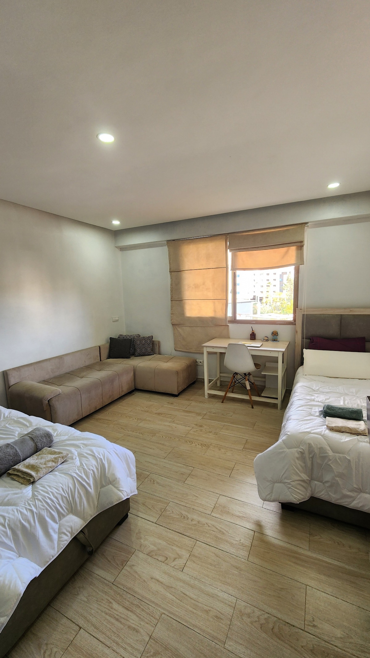 monolocale arredato, moderno ,attrezzato, situato al 2° piano con ascensore di un palazzo sicuro, di fronte alla rotonda dell'Università Med 1,oujda. Comprende una camera con due letti nuovi, due scrivanie con sedie, un divano a L e una TV. La cucina è dotata di frigorifero, fornelli,caffettiera e molti utensili. Il monolocale è inoltre dotato di aria condizionata e wifi per un comfort ottimale. La sua posizione ideale consente un rapido accesso a tutti i servizi