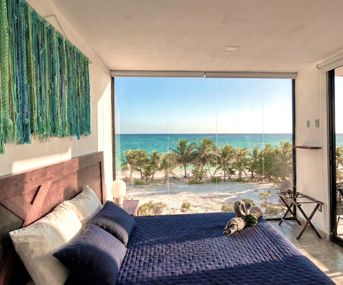 Vivi l'esperienza unica di svegliarti al suono della giungla e avere i Caraibi ai tuoi piedi. Ti presentiamo un lussuoso appartamento di fronte al Malecón di Mahahual, dove natura e comfort si fondono. Goditi la vista panoramica e ininterrotta sulla lussureggiante foresta pluviale comodamente da casa tua, con il vantaggio di avere a pochi passi la vivace vita del lungomare, con i suoi ristoranti, bar e negozi.