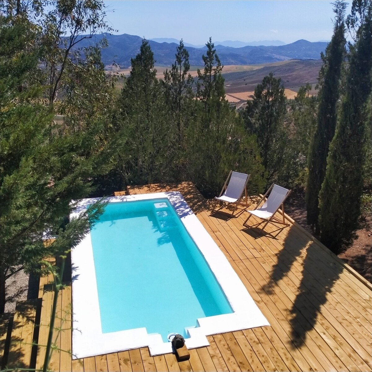 Cabane sur pilotis, en bois et baies vitrées, tout équipée, pour accueillir une personne seule ou en couple, ayant un bon esprit de convivialité, de rencontre, agréable et sympathique. En plein coeur de l'Andalousie, la maison se situe proche du village de Colmenar, au milieu des oliviers et des amandiers et à une demie-heure de Malaga. Il y a également une petite piscine privée (interdiction de se baigner avec de la crème solaire)