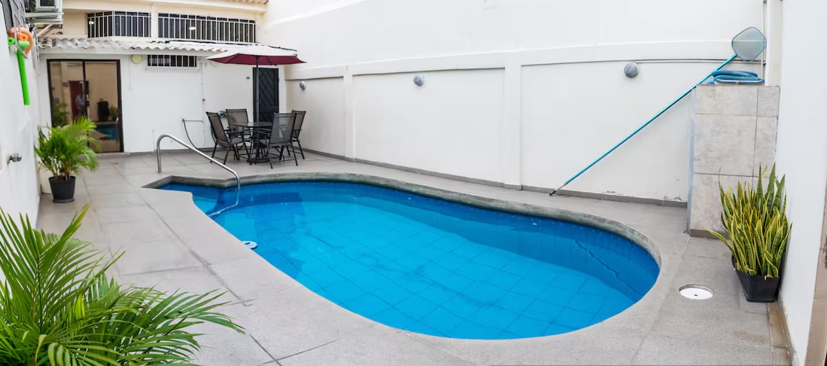 Hostal LOS SOLES SUITE Ground-floor Bedroom, located in a quiet, secure neighborhood. Its strategic location places it just 5 minutes from the airport and within easy reach of the city center, Samborondón, and the bus terminal. Within steps, you’ll find a diverse selection of restaurants and local shops. Ideal for tourists and business travelers, a cozy atmosphere, and key-code access. Note: The 15% IVA is not included in discounted reservations.