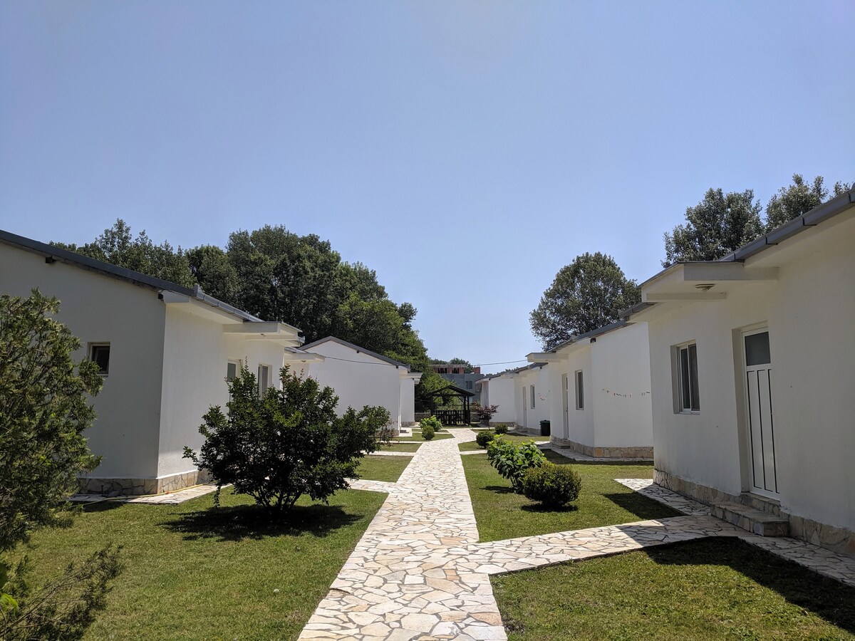 Casa privata situata a Rrjoll, a soli 500 metri dalla spiaggia, con aria condizionata in tutte le camere, tranquilla e silenziosa, con cortile privato per parcheggiare gratuitamente all'ombra, zona barbecue per te e la tua famiglia e un luogo rilassante nel cortile. La casa dispone di cucina, sala TV, due camere da letto, un bagno, una con letto matrimoniale e l'altra con due letti singoli, più un divano letto. Dispone di due balconi con una bella vista.