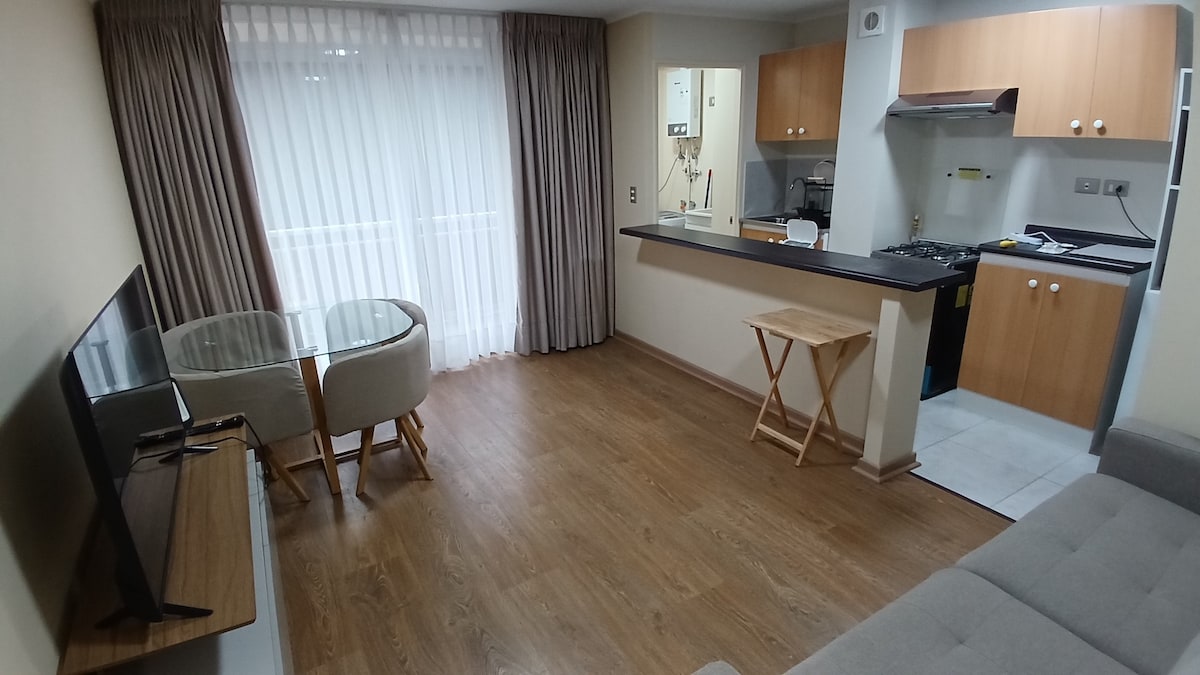 Cómodo y moderno departamento de 2 habitaciones más el area de trabajo, ideal para familias pequeñas, parejas o profesionales que buscan un espacio funcional y bien distribuido. Cuenta con un acogedor living-comedor con excelente entrada de luz natural, cocina equipada con muebles modernos y un baño completo. Las habitaciones son amplias, con closet y buena ventilación, siendo la principal perfecta con su cama matrimonial, cercano a supermercados, colegios y locomoción. Estacionamiento incluido