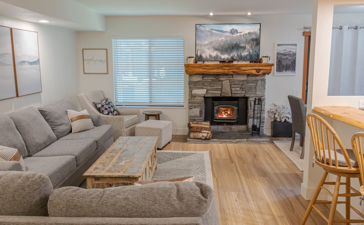 Have fun with the whole family or a romantic getaway at this beautifully remodeled, perfect location condo in Mammoth. Downstairs, corner unit: all new wood flooring, custom bathroom and kitchen. High tech, new appliances. Cozy real wood fireplace. Rainfall shower/bath tub. King Bed/Pull out foam queen couch. Walk to village in 3 minutes, shuttle across the street for mountain and other town access. Relax on all new comfortable furniture, smart TV’s. The complex has a community hot tub/sauna.