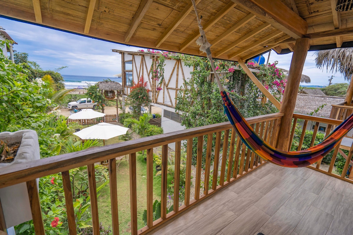 Life is about moments! Build memories to treasure in our unique beach front spot with pool, BBQ, secure parking, and magnificent views. Enjoy local & international cuisine in Montanita & Olon or find an adventure nearby (Horse riding, snorkling, surf lessons) Enjoy our practical and cozy beach bamboo suite, where you will find a fully equipped kitchen, king size bed and nice balcony to enjoy breath taking ocean views or rear balcony to enjoy bird, iguana and green views. Monthly Savings!!