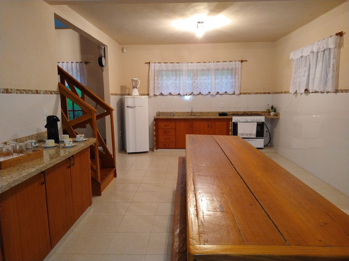 Splendida casa nel centro di Domingos Martins. Perfetto per famiglie con bambini. Grande cortile, garage coperto, cucina, area barbecue, doccia esterna, 3 camere da letto, due delle quali sono suite con letto matrimoniale e l'altra con letto matrimoniale, bagno sociale, lavanderia completa. Nel soggiorno c'è la possibilità di utilizzare un divano letto (2 posti). La biancheria da letto e da bagno non è inclusa. Sono disponibili giocattoli per bambini. È consentita la presenza di animali, che hanno uno spazio completamente recintato.