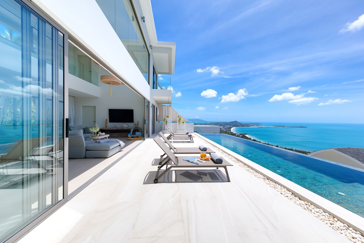 Impressionante vista sull'oceano verso Coral Cove Bay. Questa splendida casa vacanze si trova a 10 minuti in auto dalla spiaggia di Chaweng Noi, dalla baia di Coral Cove, dalle spiagge di Crystal, Silver, Lamai e Chaweng. OceanLuxe Villa offre un'intera villa privata con 2 letti, vista panoramica sul mare e piscina a sfioro privata. Due piani. 2 letti king-size, massimo 4 ospiti, 2 camere da letto climatizzate (camere da letto aperte in base alle prenotazioni effettuate)