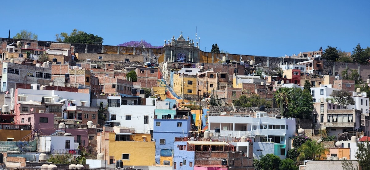 Casa situata in un vicolo pedonale del monumento a Pipila. La casa ha una vista tra le più belle di tutta la città, il che la rende un soggiorno unico. Con un letto king-size e un bellissimo balcone con vista panoramica. La casa è al centro di un giardino verdeggiante che permette la privacy in ogni momento. La casa ha due uscite, 10 minuti a piedi lungo la collina del centro e 4 minuti su per la collina sopra il belvedere di Pipila.