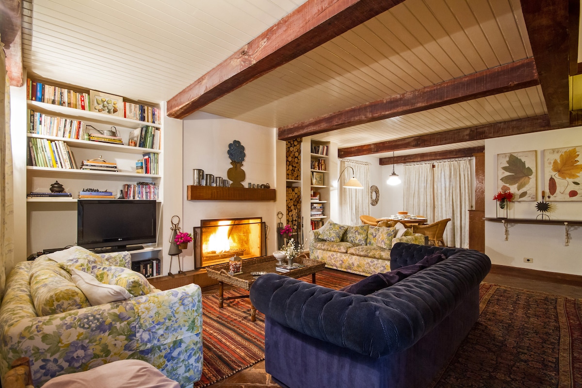 Casa de Cecília is just 5 minutes from the center of Campos do Jordão. The house is large and comfortable with 4 accommodations (3 suites, 1 bedroom). Ideal for families and groups of friends, it accommodates up to 10 people and was recently renovated. The living room is bright and has 2 rooms with a dining table, fireplace and 50' TV. In the outdoor area, be sure to enjoy the jacuzzi and barbecue. The property is fenced and has a beautiful garden with araucaria trees. We are pet friendly!