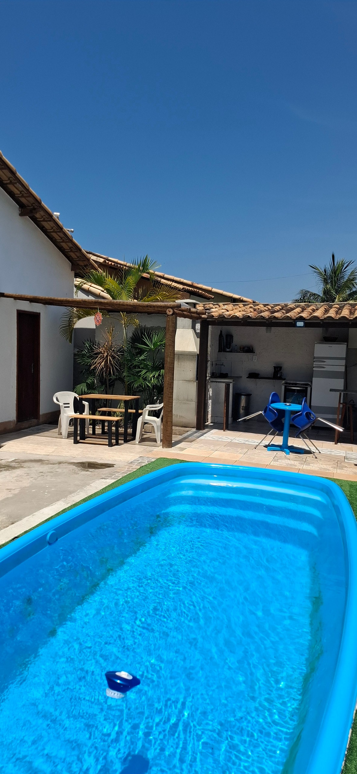 A acomodação contém suítes privativas confortáveis, climatizadas com ventiladores e ar condicionado, tv e wi-fi. O grande diferencial é a área externa com piscina 10×6, Sala de jogos completa; Área Gourmet; Sala de jantar e Mezanino; Quintal amplo e arborizado. Além da proximidade da praia do recanto (900m), 10 min à pé.