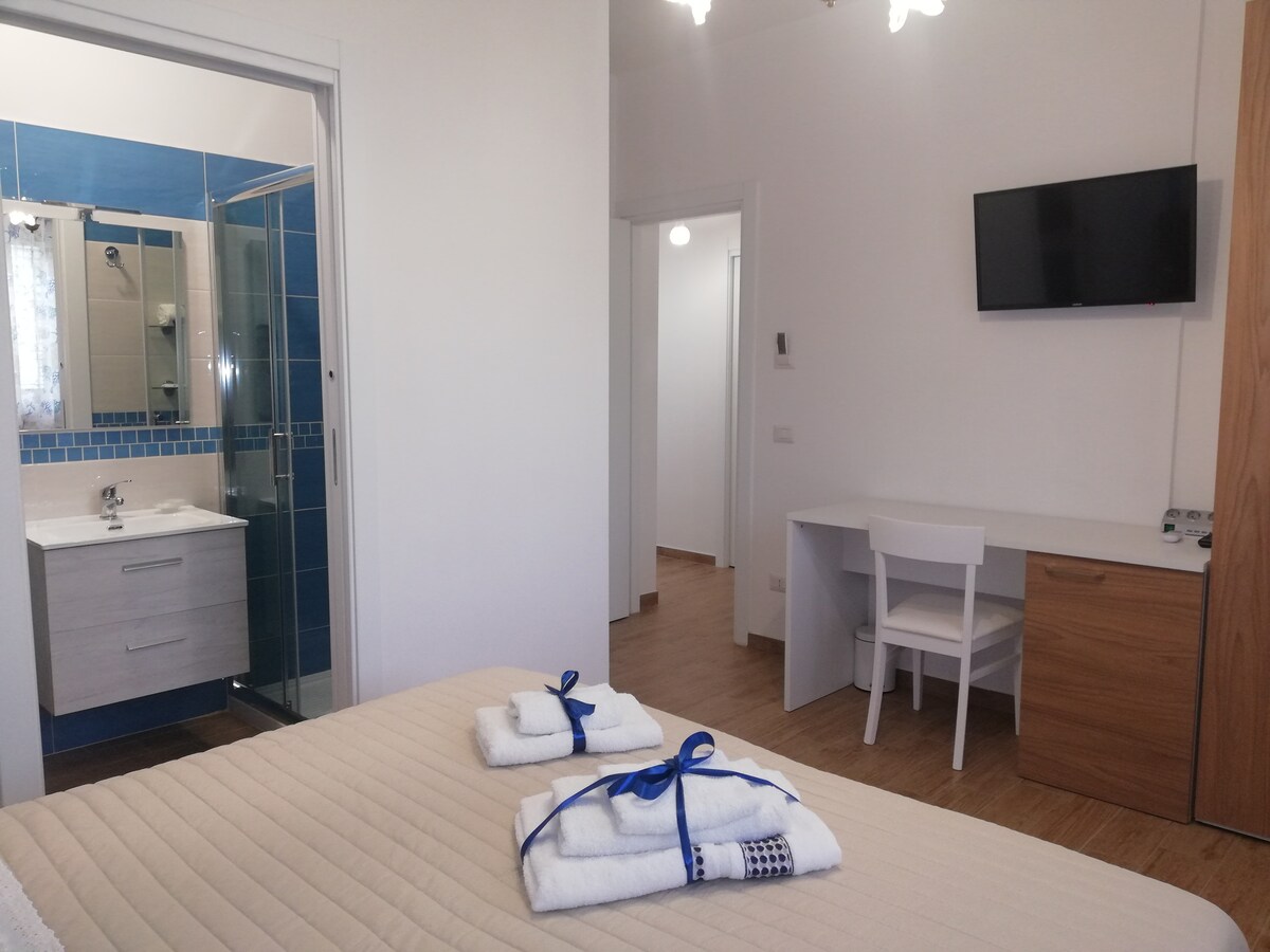 Completamente ristrutturato e arredato con finiture moderne, la stanza dispone di un'ampia camera con tutto l'occorrente: scrivania per lavoro, minifrigo, cabina armadio, smart TV e un balcone che ammira il golfo di Policastro e il Monte San Biagio, dove è situato il Cristo Redentore. Il bagno privato offre una vista mare ed è completo di asciugacapelli, lavandino, bidet e doccia. Inoltre, la stanza è dotata di un sistema di climatizzazione.