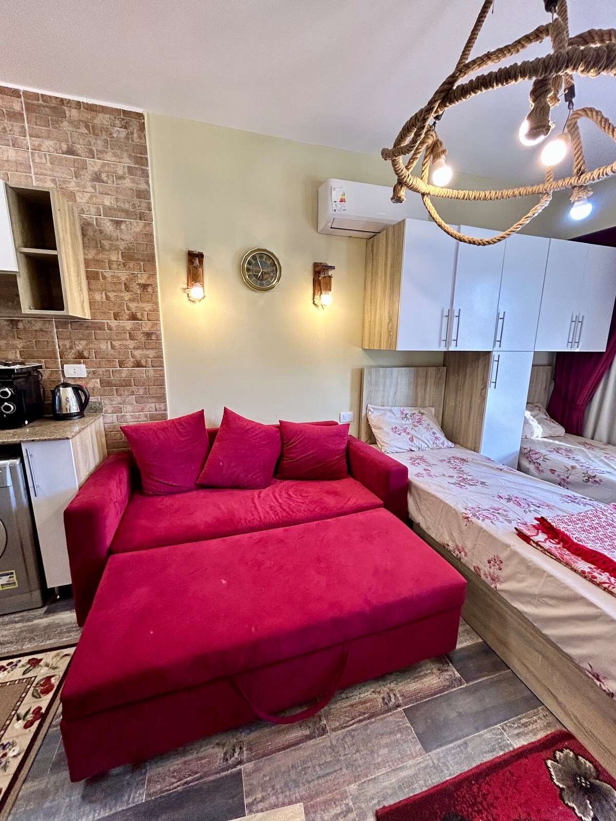 My apartment is cozy with simple and comfortable style. It's located on the ground floor with a garden view with direct view of the swimming pool, which is very relaxing. It's a great place to hang out and change your surroundings. Also there is security in everystreet of the resort ,and 2 main restaurant in front of the sea And 3 huge supermarket inside the resort you donot need to go out !! And for sure its has a private beach with a private golf car Its 5 mins away from hamam city♥️