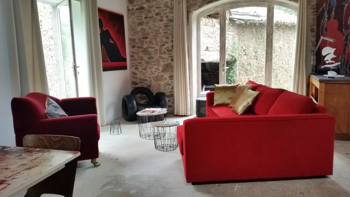 Immerso nella natura in un vecchio mulino, l'Atelier 22 è un tranquillo open space d'artista dotato di fibra. Tra Lione e St-Etienne (45 minuti) con giardino, fiume, stagno, foresta. Per fare musica, lavorare, sogniare ad occhi aperti, tubare, passeggiare in una campagna verdeggiante (escursioni, mountain bike). Parcheggio privato gratuito, attrezzature per la pittura, mobili da giardino, barbecue... Ideale per 2 (letto 160) +2 pers. su divano letto e altri 2 nella Carabane (estate). Un paradiso per vivere un'esperienza autentica.