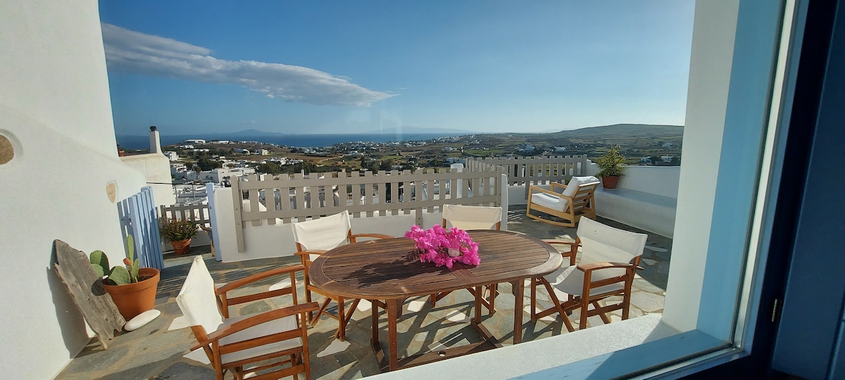 La nostra tradizionale casa in pietra delle Cicladi (65 mq) si trova nel centro del villaggio e dispone di un meraviglioso giardino con alberi di limone, arancio, melograno, albicocca, avocado e uva, dove potrai rilassarti e goderti la natura. L'appartamento offre una vista panoramica sul villaggio e una vista mozzafiato sul mare dell'isola di Naxos. La casa è ecologica, adatta al lavoro e alimentata a energia solare. Il wifi è affidabile anche per il lavoro. Accettiamo soggiorni più lunghi. Tutto ciò di cui hai bisogno dista 20 metri a piedi.
