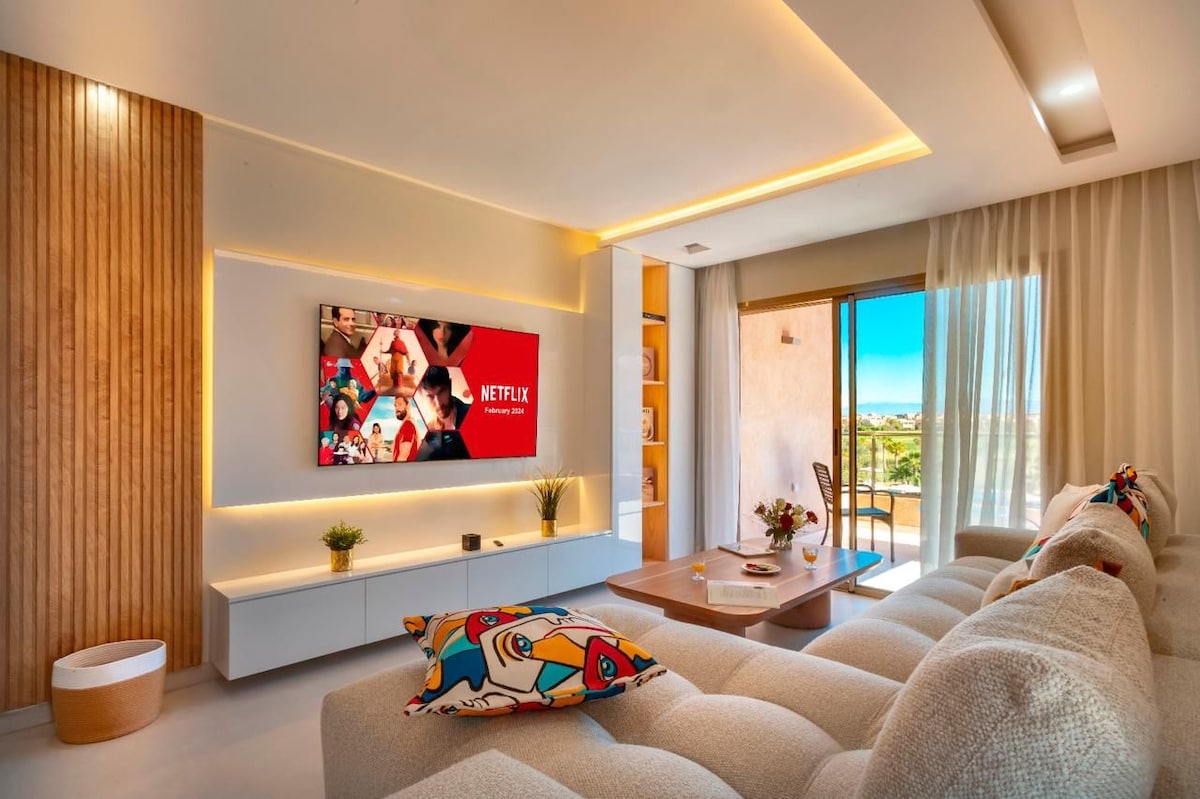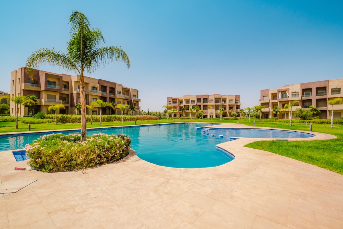 Cerchi un alloggio unico a Marrakech? - Appartamento moderno e luminoso con vista mozzafiato sul campo da golf - A soli 5 minuti dall'aeroporto e a 10 minuti dal centro città -2 comode camere da letto, ideali per coppie, famiglie o lavoro a distanza - Accogliente soggiorno con smart TV e sistema audio per momenti di relax - Ampia terrazza soleggiata immersa nel verde - Accesso a 3 piscine in una residenza sicura 24 ore su 24 - Aria condizionata, Wi-Fi veloce e parcheggio gratuito - Comfort vicino alle principali attrazioni di Marrakech - Self check-in