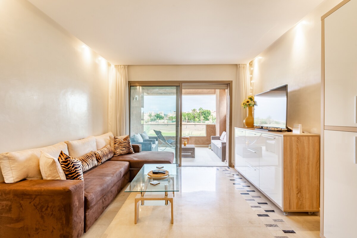 Appt 2 pièces - 52 M2 pour 4 personnes en Rez de jardin dans l'une des plus prestigieuse résidences golfiques de Marrakech. Vous serez au coeur d'un cadre de verdure avec une piscine équipée de transats ainisi que d'un bassin pour les enfants. Vous aurez a disposition un salon aménagé d'un canapé - lit avec espace TV ainsi que d'un bar de séparation avec sa cuisine entièrement aménagée et équipée, une chambre avec un lit double 140, WC, un coin repas ext, un barbecue, Wifi..