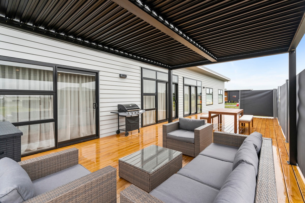 Built in 2020, this house has been especially designed for the adult get away. No-one loses here; four equal sized bedrooms, each with a super king bed. Living spaces have been maximised, and focus is given to creating an ambience of sophistication. With 8 metre opening glass sliders, there is seamless inside-outside living. There are multiple decks and seating areas outside, and an alfresco dining area. This house is suited for gatherings, and yet, is also perfect for a quiet retreat.