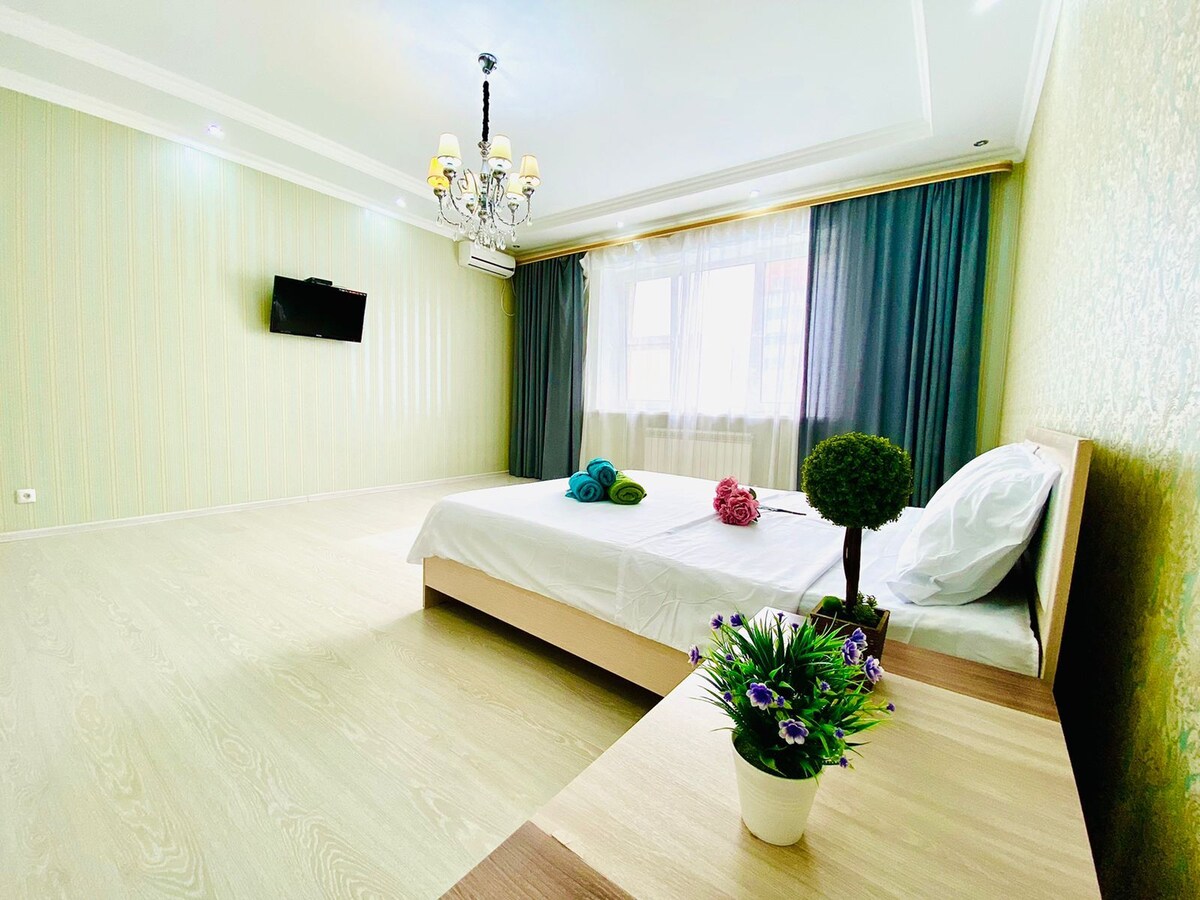 Non dovrai aspettare che le chiavi vengano portate. Poiché abbiamo accesso senza chiavi all'appartamento. Nelle vicinanze si trovano: Keruen City Mall, centro città, parco acquatico, parco del primo presidente, parco del triathlon, Oner Ortaligh, ufficio del registro civile, ristorante McDonaldS e molti altri luoghi significativi della città. - In 10-15 minuti di auto si arriva all'aeroporto e trascorrerai 15 minuti in auto dalla stazione ferroviaria - L'appartamento ha tutto il necessario per un soggiorno confortevole.