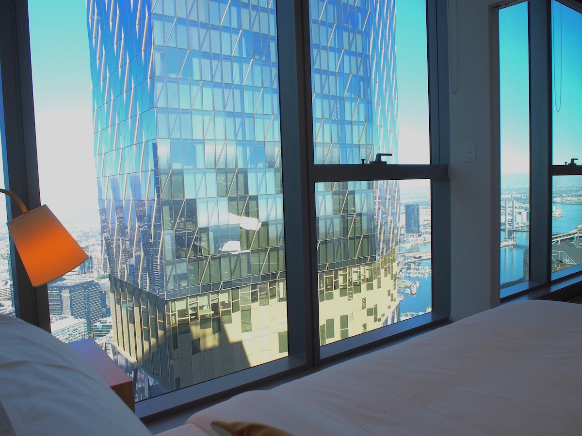 Enjoy a clean, relaxed experience at this centrally located place. Try the top floor! In Melbourne CBD this place really stands out. Phenomenal sunsets! Unencumbered views to the bay, rivers, Docklands, WestGate & Bolte Bridges, distant hills, city lights. Convenient. Walk to Crown, ConventionC, Marvel Stadium, Southern Cross Station, il Mercato Centrale. Great amenities: Pool/spa/sauna/gym. 1x Quality queen bed + Quality 2x sofa beds, linen, Hot shower, Kitchen, Ergonomic Desk, AppleTV