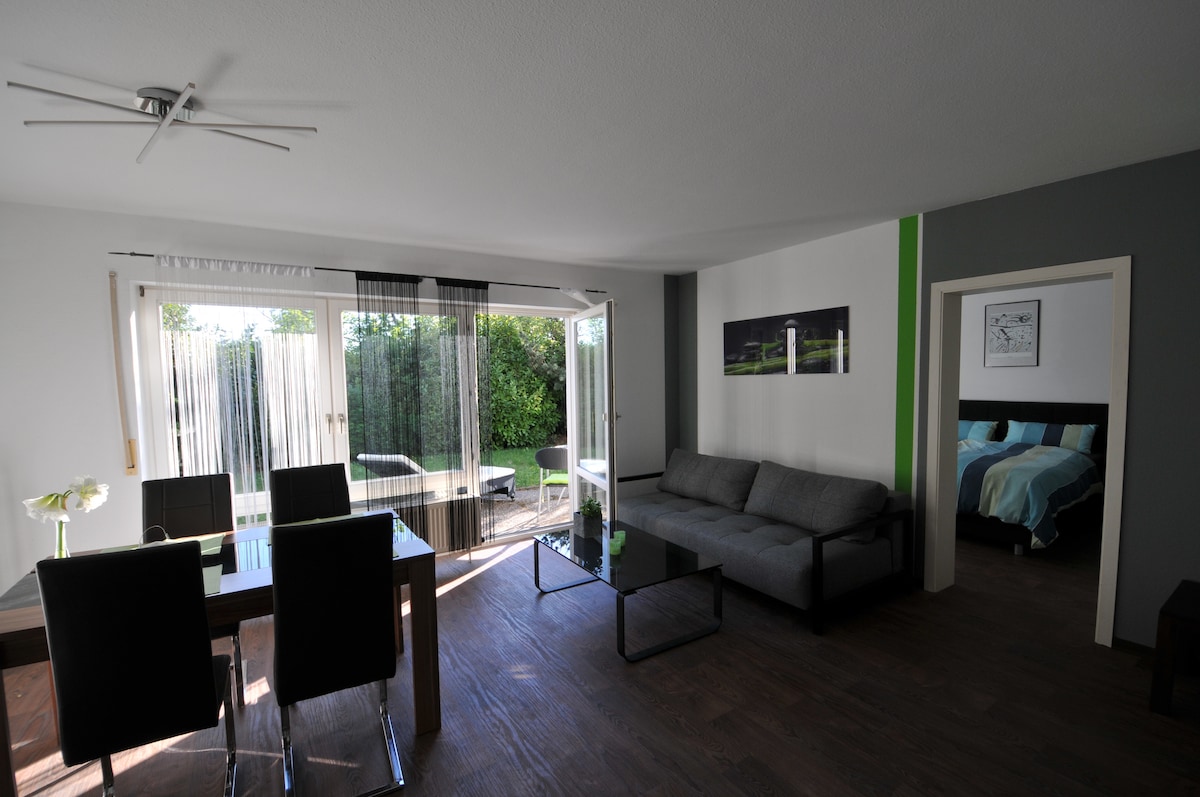 Appartamento al piano terra La descrizione dice che si tratta di una piscina in comune. Viene usato di tanto in tanto da noi stessi. È possibile prenotare la piscina ogni giorno, per più ore. Avete un accesso privato alla piscina dall'appartamento! Dall'inizio dell'estate 2026 ci sarà una sauna esclusiva, che può essere prenotata come opzione. È consentito fumare solo all'aperto!! Gli animali domestici sono ammessi, ma si prega di chiarire PRIMA della prenotazione e di specificarlo nella richiesta.