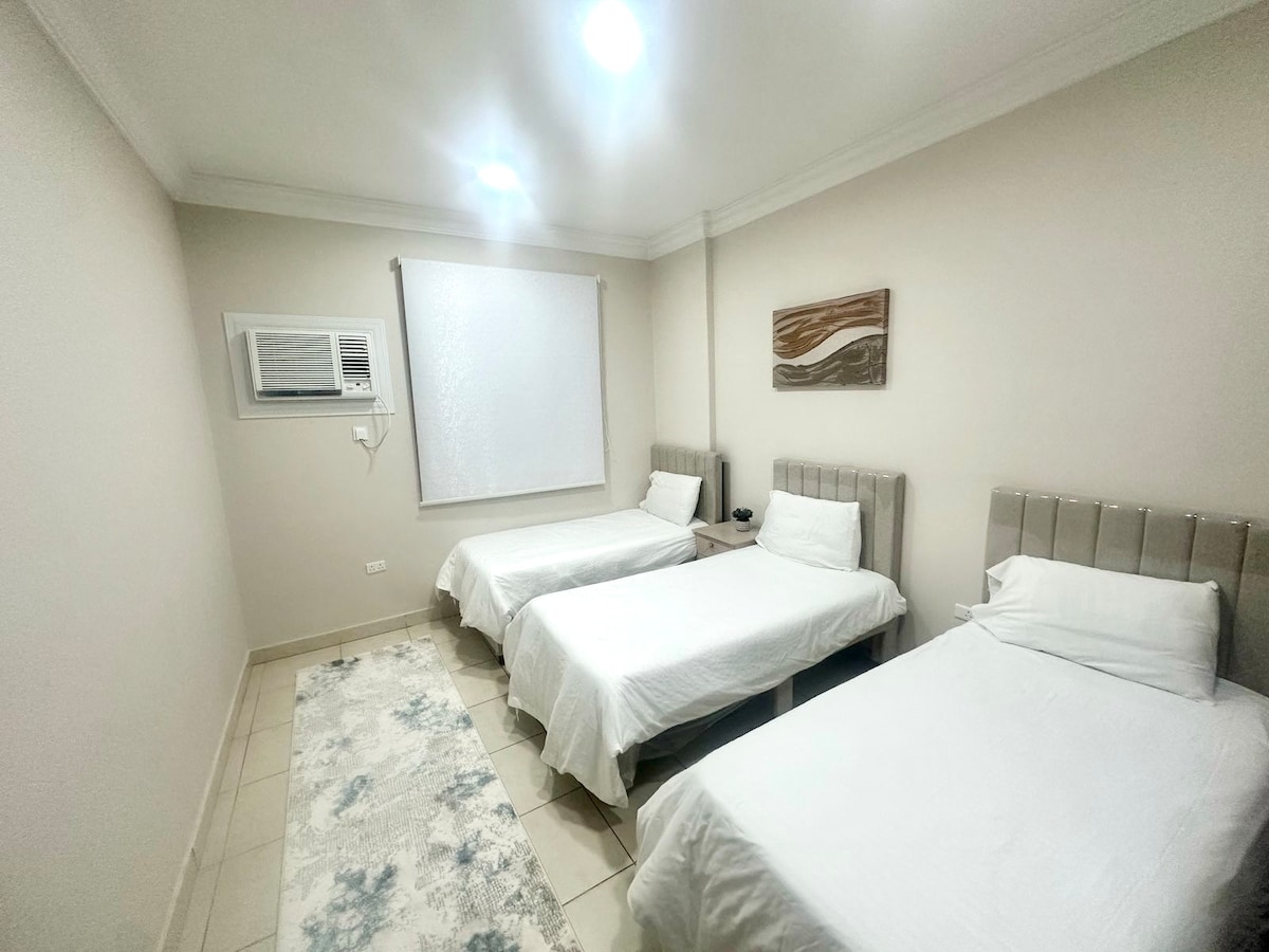 - Situato nella zona di Rabwa della Mecca - A 5 minuti di auto dalla stazione ferroviaria di Makkah Harmain (15 minuti a piedi) - Lussuoso appartamento con una camera da letto, recentemente ristrutturato - Ampio e spazioso soggiorno con arredi eleganti - Comodo letto super king-size - Servizi moderni tra cui una grande TV da 55 pollici - Situato a 5 km dalla moschea al-Haram, a meno di 10 minuti in auto senza traffico - Moschea locale a pochi minuti a piedi - Ideale per i pellegrini che cercano comfort e praticità in un ambiente tranquillo, è perfetto per viaggi di gruppo.