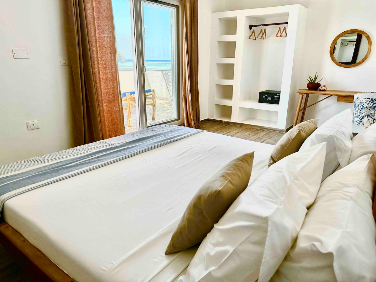 Immagina di svegliarti nell'appartamento Just Heaven – Heavenly Horizon, 120 m² di lusso al primo piano, sospeso appena sopra l'oceano. Apri gli occhi e davanti a te si apre una vista spettacolare sull'orizzonte infinito, dove il cielo incontra l'acqua nei toni del blu e dell'oro. Dalla terrazza si può ammirare il sole che sorge sulle onde e, dopo una breve passeggiata, si può salire su una barca per osservare i delfini e la favolosa barriera corallina di Mnemba dopo 20 minuti. Non esistono posti del genere.