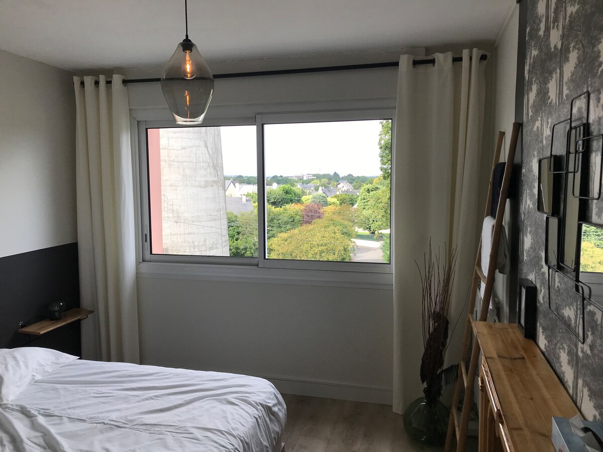 Alloggio molto attrezzato si trova all'ultimo piano:una cucina a vista , un ampio soggiorno con click-clac,una grande camera da letto e bagno (superficie 60m2) si trova a 3 mm dalla stazione ferroviaria di Laval e a 10 mm per raggiungere il centro città . Posto auto privato messo a disposizione.Terrazza. Per i bambini un letto,materasso di cambio e vasca da bagno sono messi a disposizione. L’appartamento è collegato a Internet in fibra ottica. La biancheria è fornita (lenzuola, asciugamani). Caffè o tè messi a disposizione.
