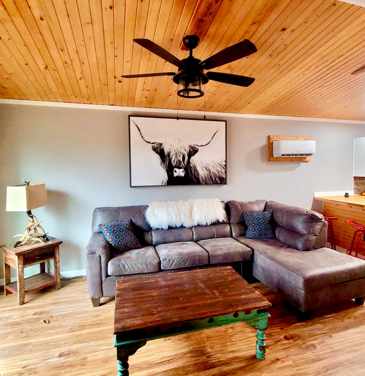 Cabin at the Falls offers a serene retreat surrounded by Ozark beauty and wildlife. Custom-built on a wooded hillside, it overlooks a seasonal stream and waterfall. Guests can relax on the porch in rocking chairs, soaking in the peaceful views. Inside, the cabin combines rustic charm with modern comforts, featuring a cozy queen bed, a well-equipped kitchen, and a bathroom with both a tub and shower — perfect for a relaxing getaway.
