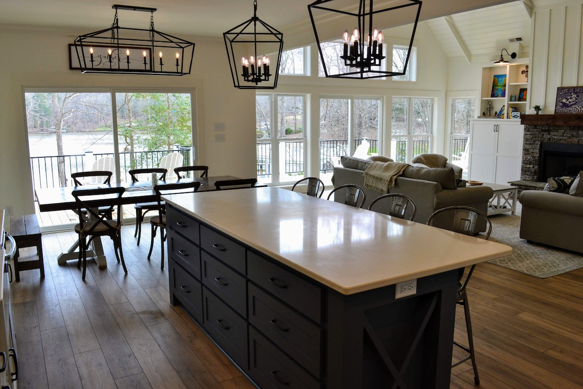 Have fun w the whole family at this new farmhouse style lakefront home w boathouse in lg cove. Very close to water w flat backyard 5 bedrm 4 full bathrm, sleeps 11. 1 king, 2 queens, 2 twin trundle beds w rollout mattresses, twin over full bunk bed. Gas fireplace, firepit, grill, washer/dryer, air hockey/ping pong table, screened in porch & porches off bedrooms, outdoor shower, 2 paddle boards. Pet friendly if well-behaved. Linens included in cleaning fee. PLEASE READ HOUSE RULES BEFORE BOOKING