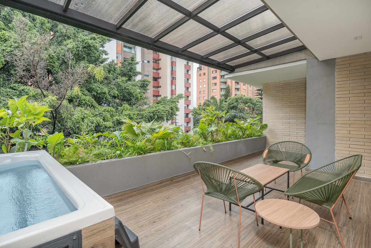 Nuovo appartamento completamente arredato di 51 mq + 38 mq di terrazza con vasca idromassaggio, aria condizionata e wifi gratuito. Si trova a El Poblado, una delle zone più esclusive di Medellin, a soli 5 minuti a piedi dalla stazione della metropolitana Aguacatala e a 10 minuti a piedi da 2 dei principali centri commerciali della città. L'edificio dispone di accesso gratuito all'area coworking e alla palestra, nonché di un servizio di sicurezza 24 ore su 24, 7 giorni su 7 e di un parcheggio gratuito.