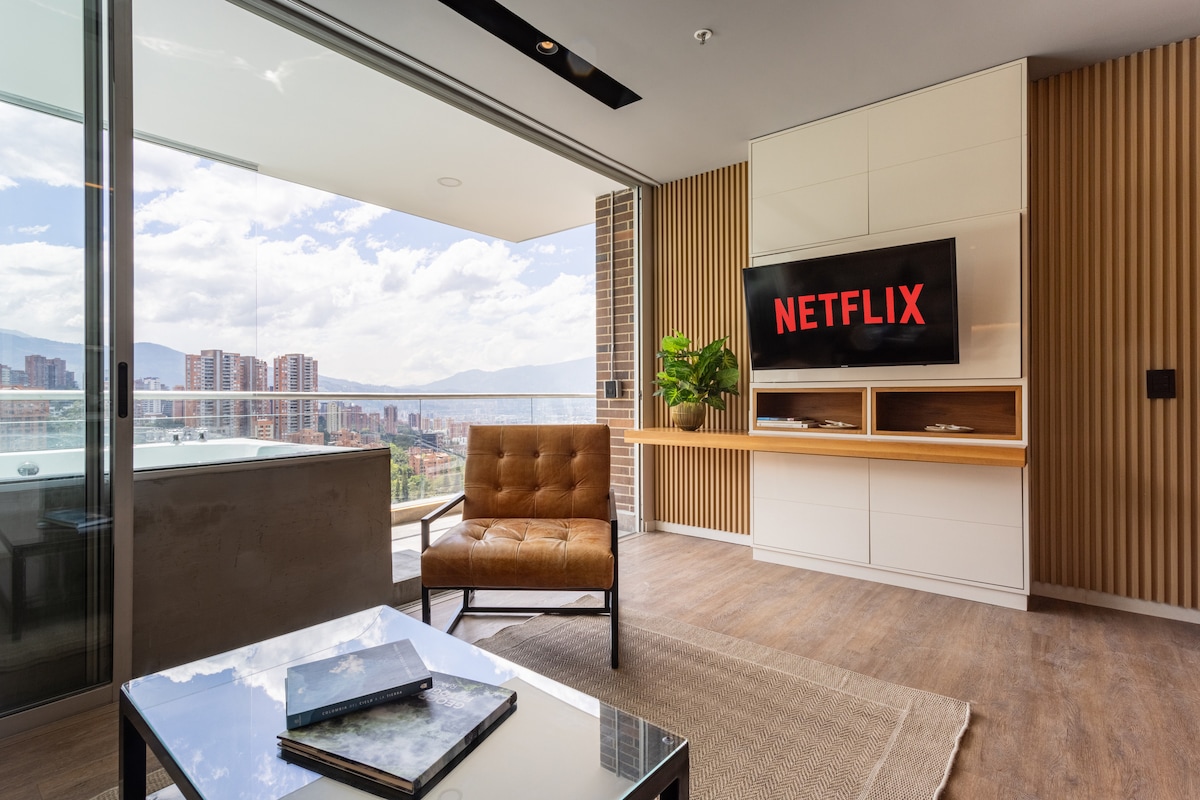 Premium 21st-floor El Poblado apartment with private jacuzzi, panoramic skyline & mountain views. Relax on your balcony, stay comfortable with A/C, work with high-speed Wi-Fi and dedicated workspace, and enjoy 3 HD TVs with Netflix, fully equipped kitchen, washer/dryer, and tea/coffee station. Access spa, gym, steam room, pool, restaurant & cafeteria. Short drive to Parques Lleras & Provenza — the ultimate high-rise retreat for luxury, style, and comfort.