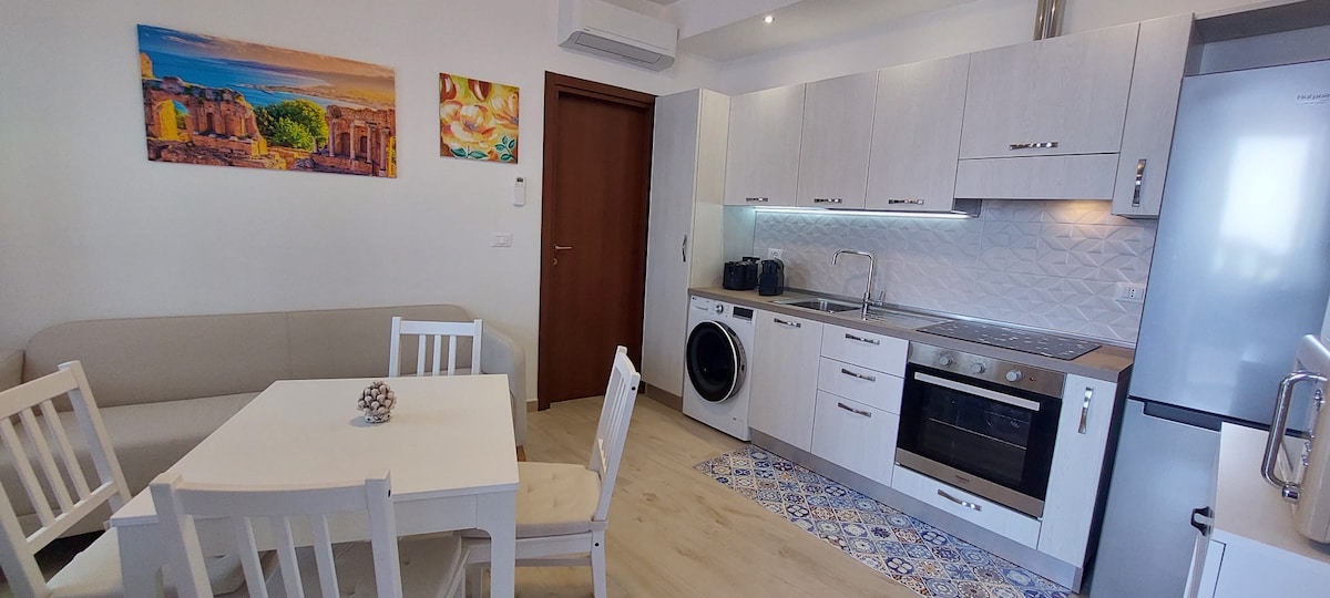 Confortevole appartamento di 40 metri quadri al primo piano raggiungibile da una rampa di scale di circa 20 gradini.Può ospitare fino a 3 persone preferibilmente 2 adulti e un bambino, situato nel cuore di Mazzeo (Taormina mare) a soli 20 metri dalla spiaggia. Dotato di tutti i confort e di nuova costruzione.Sotto casa c'è la fermata del bus e a 5 minuti la stazione dei treni. Il parcheggio è libero in strada. A pochi passi ci sono bar , alimentari,ristoranti ,pub insomma tutto il necessario.